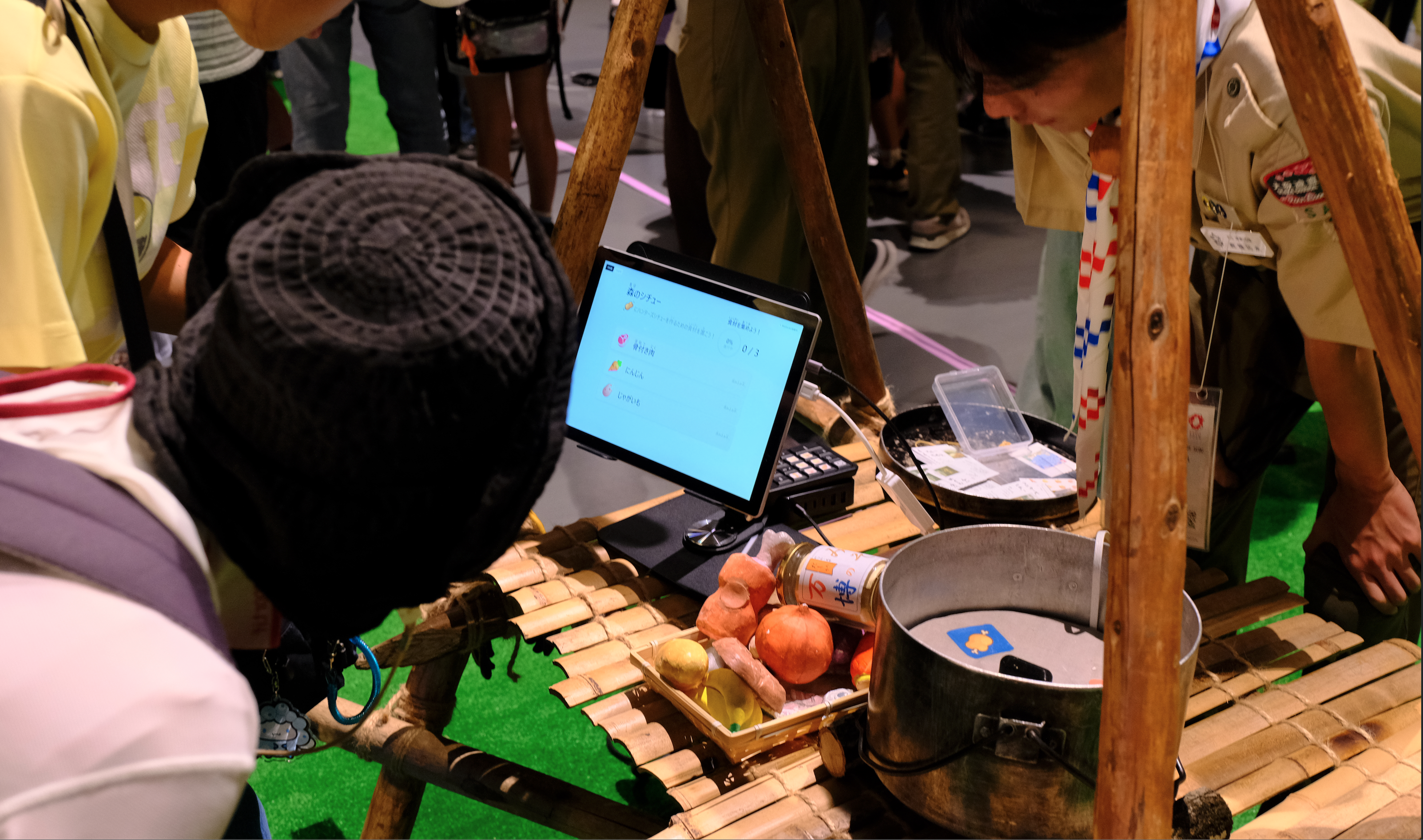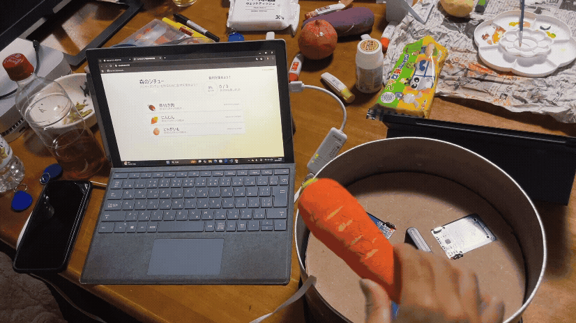 ディスプレイをタッチするだけじゃ芸がないので、実際に食材(食品サンプル)をコッフェルに入れることで調理が進むようにしました。